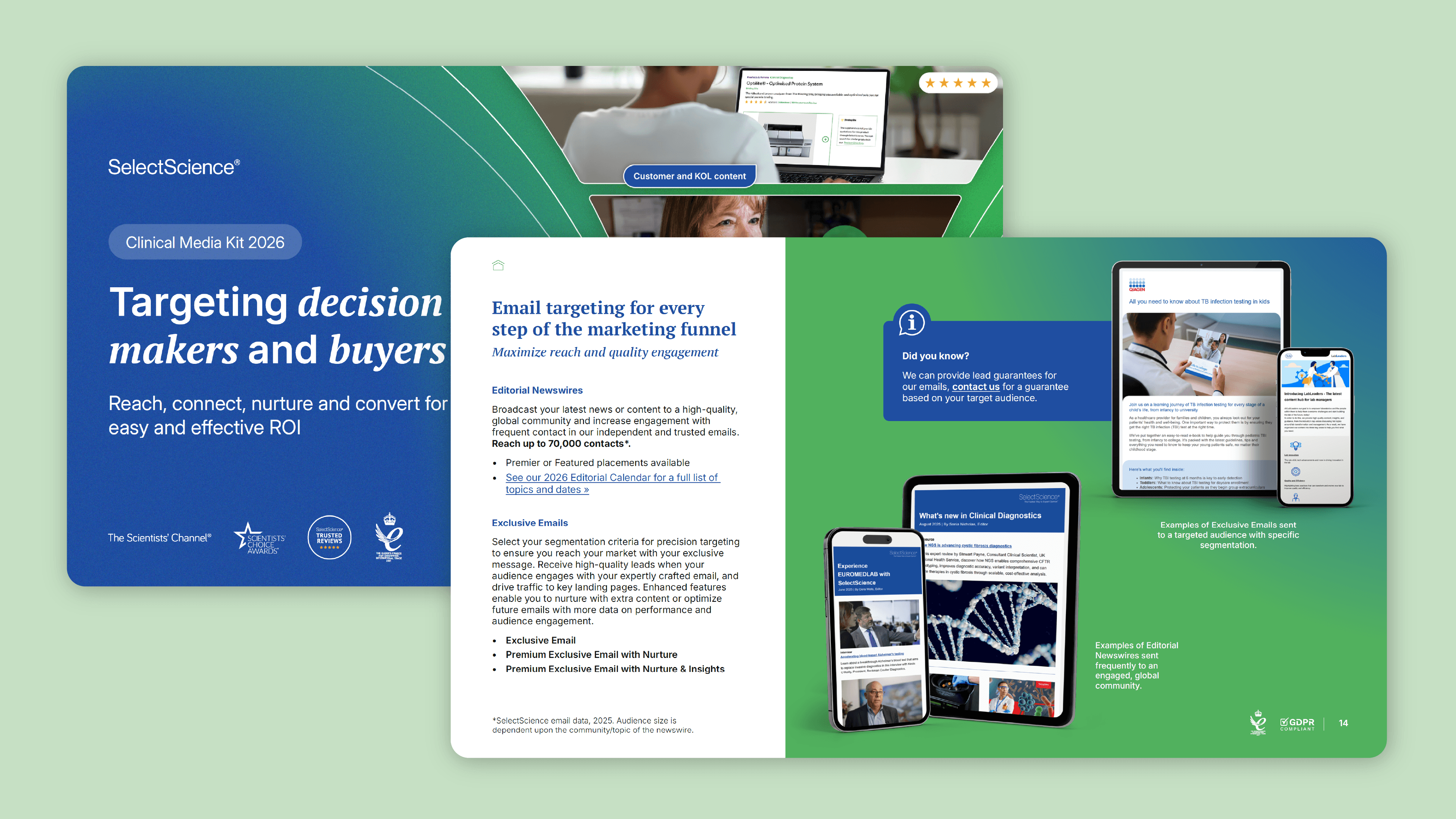 I created an eye-catching front cover that built upon the previous year’s iteration, incorporating SelectScience’s iconic gradient. The funnel-shaped design with product mockups highlights how SelectScience supports scientific marketers across all stages of the marketing funnel. Incorporating images taken from interviews with high profile scientists demonstrates SelectScience’s authenticity and expertise.