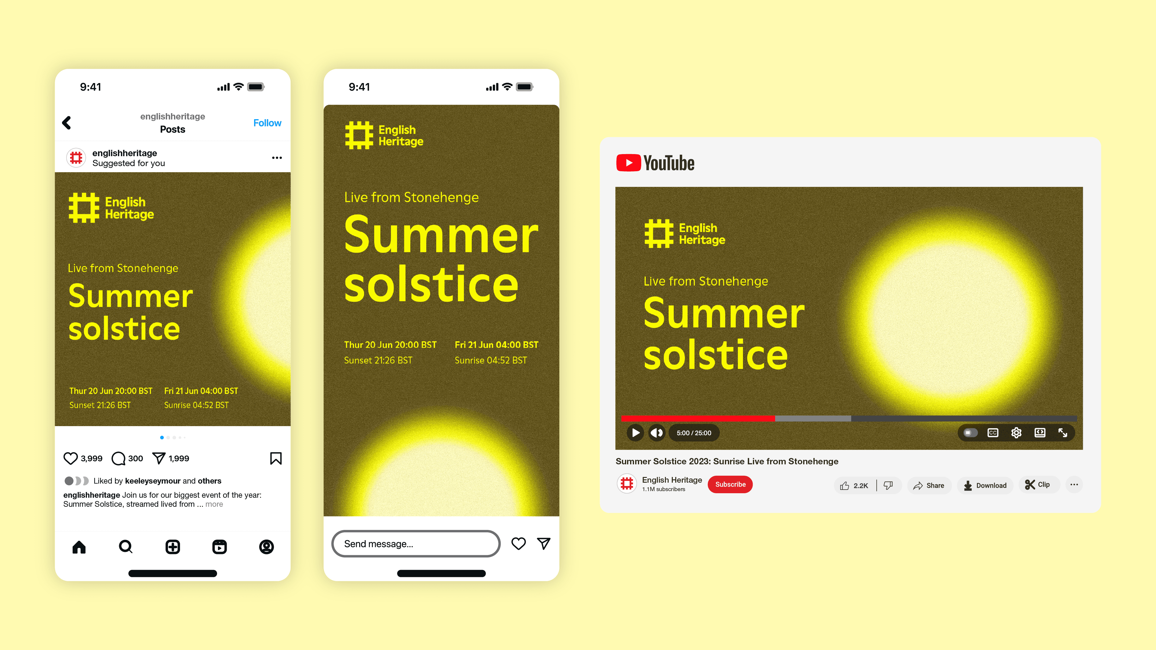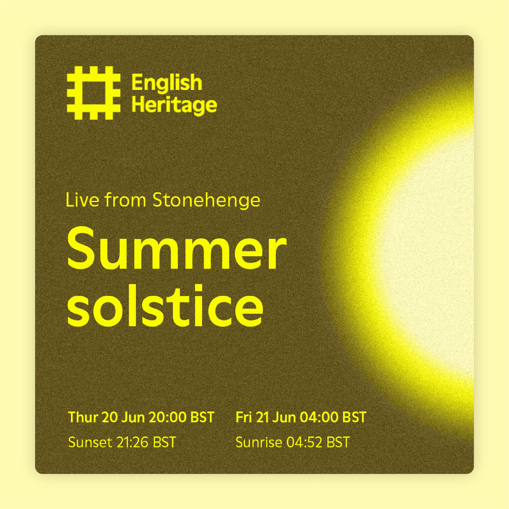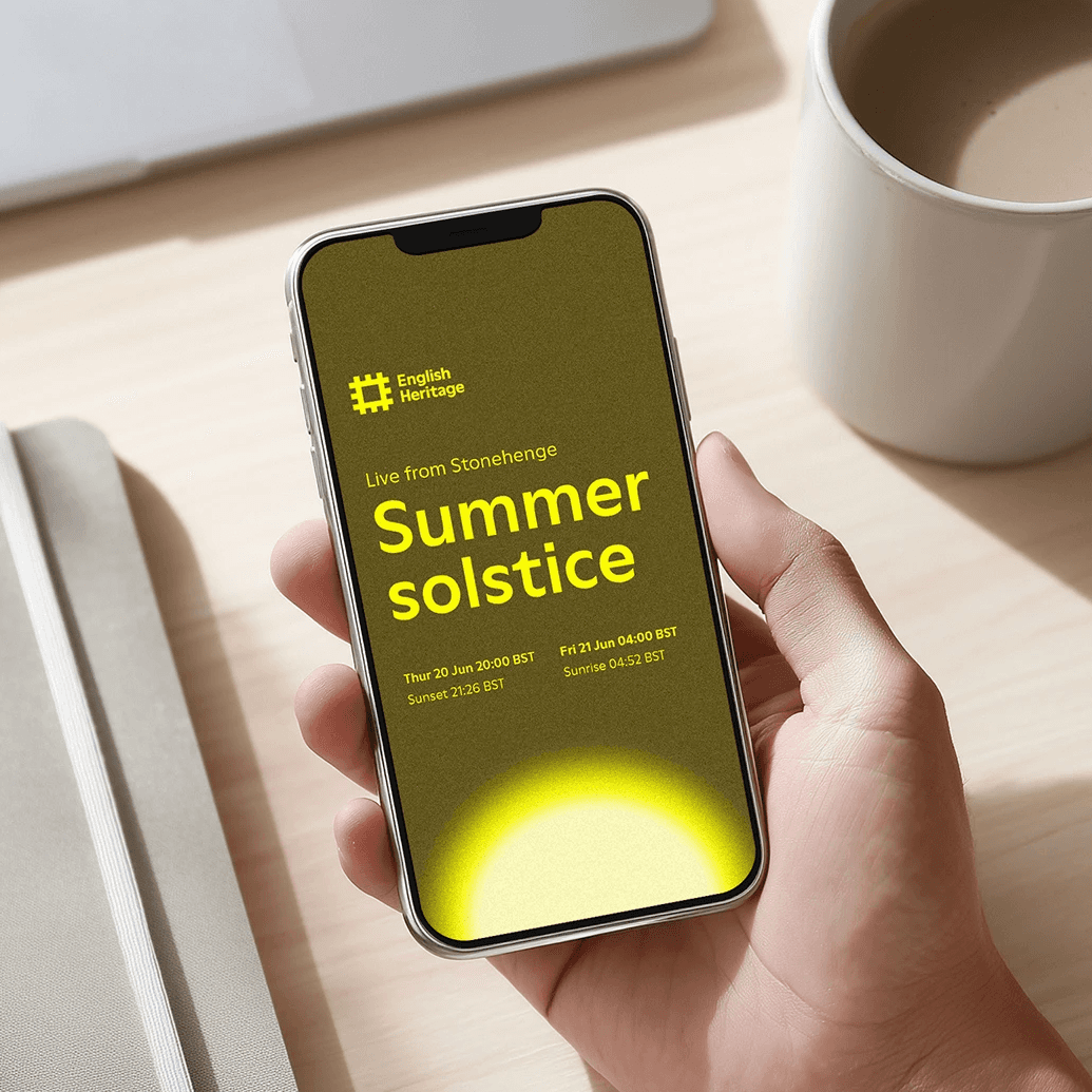 In the time since the previous Summer Solstice livestream, English Heritage had launched a refreshed brand and visual identity. The challenge here was therefore to evolve the successful campaign from last year, retaining what worked while bringing it in line with the new branding principles.