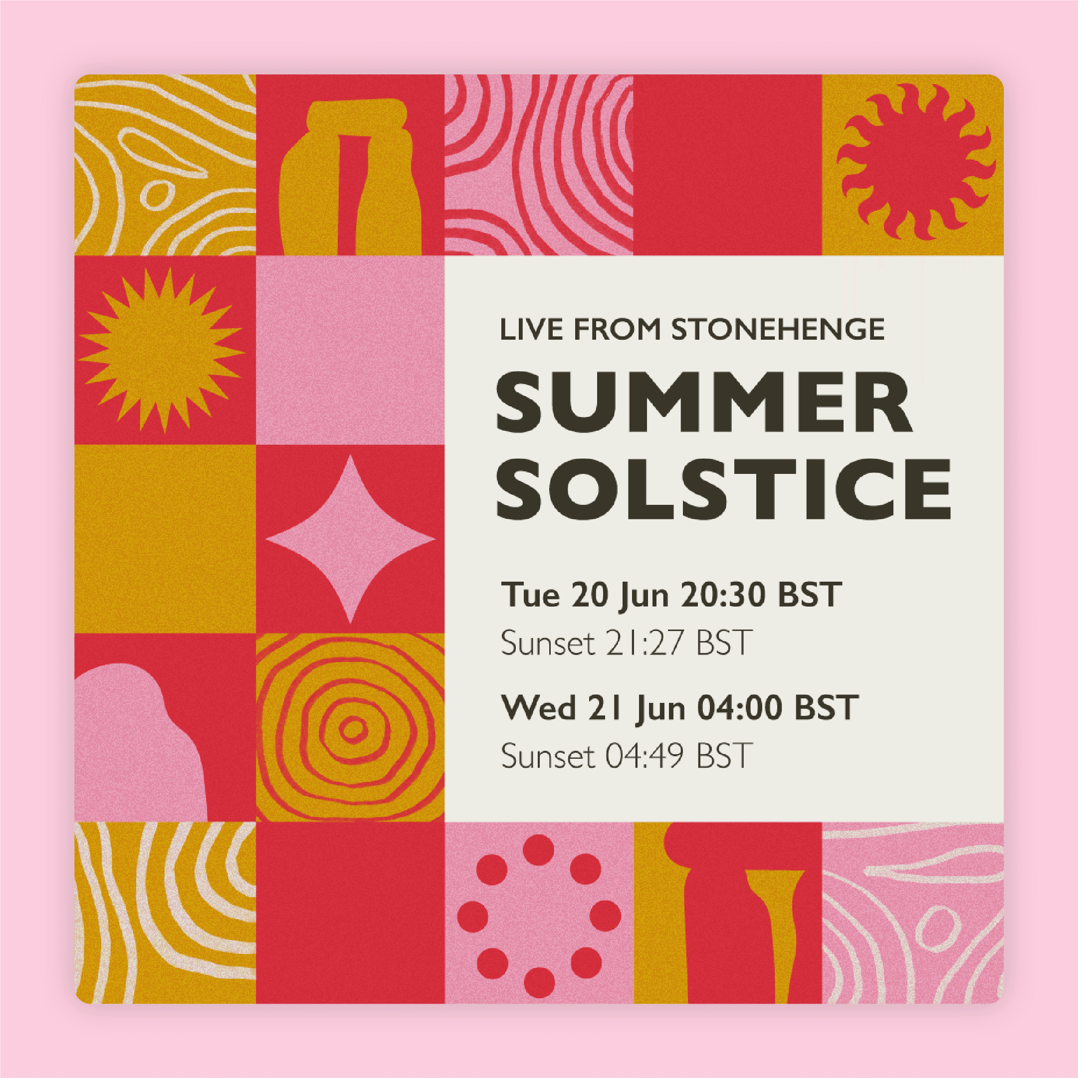 I developed initial static concepts for the Summer Solstice campaign, ensuring the design would work across different formats and sizes. After sign-off of the concepts, I brought them to life through animation in After Effects, designing a cohesive motion system including intro animations, social graphics and lower thirds.